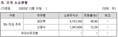 권인택 대표이사 최대주주와 신준수 임원, 자사주 총 61.97% (상장후 50.22%), 1~5% 주주조합은 12곳, 1%미만 투자조합/소액주주 12곳쯤 있습니다.