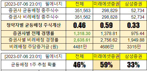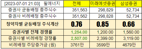 @2023-07-04 청약첫날, 전체경쟁률 87.90:1, 미래에셋증권 85.05:1, 삼성증권 104.03:1
