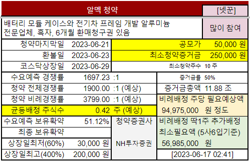- 상장예정일: 2023-06-29 (38과 IPOstock 두 사이트, Pstock 정보없음) → 2023-06-30 (비공식채널에서 30일로 바뀌었다고 들었습니다)