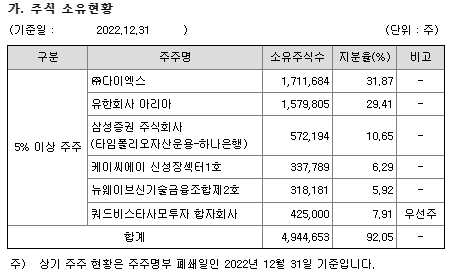 최대주주 #다이엑스 (지분 31.87%) 비상장 주식회사이고, 소액주주는 40명 1.56%로 적네요.