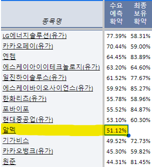 - 우리사주 물량은 15만주중 112,455 청약했네요. 2.5% 모자라네요.