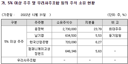 5% 이상 주주는 최대주주/임원 (지분 32.67%)과 KDB산업은행과 컴퍼니케이 고성장펀드 등이고, 소액주주는 38명 11.34% 수준입니다.