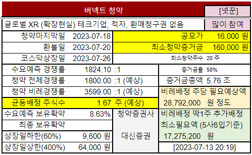 @2023-07-17 (지난주말2023-07-14) 수요예측결과를 정정했는데 가장 중요한 기관경쟁률을 내렸네요. 1,824.10:1 → 1,520.08:1, 이렇게 바꾸면서 공모가는 그대로 뒀네요. 금감원에서 이런건 제제없을까요? 옆에 있으면 한대 쥐어박고싶네요. 청약참여도 낮춤: "많이" → "보통"
