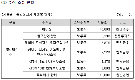 최대주주 하태진 대표이사가 43.86%로 지분율이 높고, KDB산업은행과 투자조합/펀드/기금 등과 #한화 지분이 좀 많이있고, 소액주주는 1명 0.66%로 적은 편이네요.