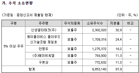 초전도체 테마관련 #퀀텀에너지연구소 주식보유로 폭등했던 #신성델타테크 회사가 모회사(최대주주)로 32.9% 지분 보유중이며, 안병두 대표이사와 구본상 신성델타테크 사장, 구본상 대표의 에이비씨엠 (투자회사) 등 특수관계인들까지 합하면 74.2% 지분이 있으며, 투자조합들 외에 소액주주 4명 2.12% 수준입니다.