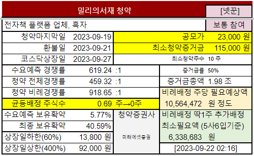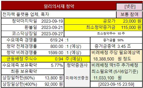 @2023-09-15 수요예측결과: 기관경쟁률 619.24:1, 보유확약 5.77%, 공모가 23,000원 (=공모가밴드상단)