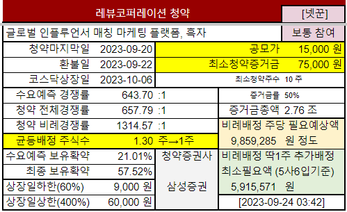 - 상장예정일: 2023-10-05 (#두산로보틱스 상장일 겹침) → 2023-10-06 변경된다는 얘기가 있음 (현재는 3개 사이트 모두 5일)