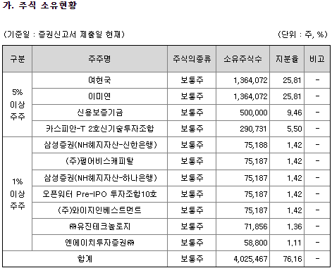 특이한 게 설립이후 최대주주가 여현국 각자대표와 이미연 각자대표의 지분이 조금씩 바뀌긴 했지만 결국 계속 동일하게 맞춰서 꾸려가고 있네요. 여러 투자조합외에 1%미만 소액주주는 1492명 23.84% 정도 됩니다.