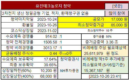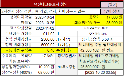 @2023-10-20 (어제)수요예측결과, 기관경쟁률 914.02:1 (아주 좋은 편), 보유확약 17.64% (조금 좋은 편), 공모가 17000원 (공모가 밴드 상단 14500원보다 많이 위쪽), 청약참여도 올림: "보통" → "많이"