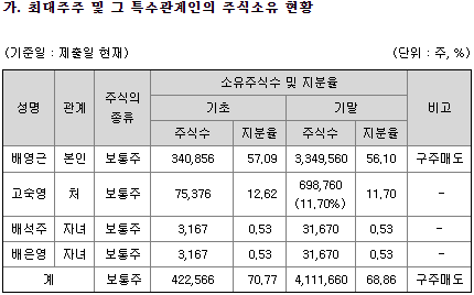 최대주주 배영근 대표이사가 56.1% 지분이 있고, 일가족 포함 68.86% 경영권지분을 보유하고 있는데 투자조합 수개를 빼고, 소액주주 12명 0.22% 수준입니다.