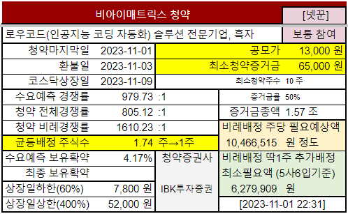 @2023-11-01 청약마감 전체경쟁률 805.1165:1, 균등배정 1.74주