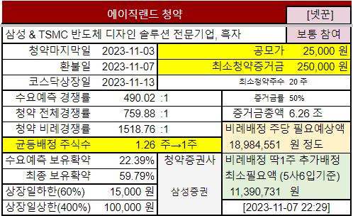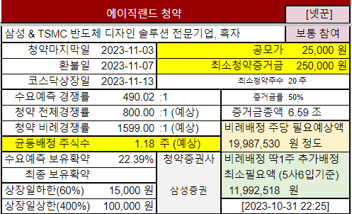 @2023-10-31 수요예측결과, 기관경쟁률 490.02:1 (보통), 보유확약 22.39% (많이 좋네요), 공모가 25000원 (공모가밴드 상단 21400원을 훌쩍넘게 설정했네요), 경쟁률이 낮은데도 불구하고 올렸네요. 요즘 공모가를 계속 올려서 할인을 한 효과가 다 사라지는 느낌이네요.
