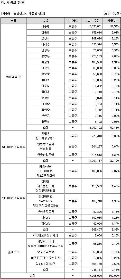 이종민 대표이사 32.54% 지분과 특수관계인까지 포함한 경영권지분은 59.43%이고, 여러 투자조합 들이 있으며, 1%미만 소액주주는 55명 9.46% 수준입니다.