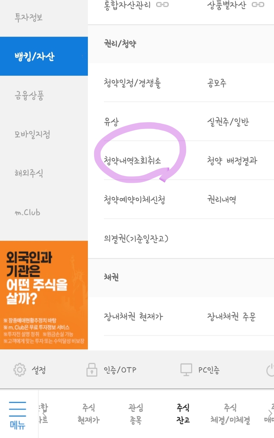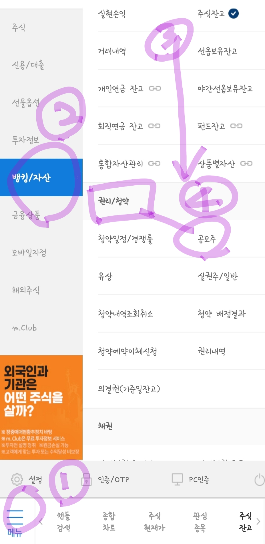 3-2) 미래에셋대우 앱에서 메뉴 -> "뱅킹/자산" -> 오른쪽화면에서 아래쪽에 있으니 조금내려가서 "권리/청약" 부분의 "공모주" 선택하신 다음,