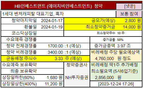 2023-12-04 이데일리: [마켓인]HB인베스트먼트, 증권신고서 제출…내년 1월 코스닥 상장
