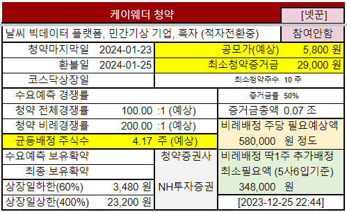 2023-12-22 한경마켓인사이트 FREE NEWS: 날씨 빅데이터 기업 케이웨더, 내년 초 상장‥시총 500억원 도전