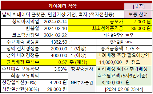 @2024-02-08 수요예측결과, 기관경쟁률 1,362.50:1 (아주좋음), 보유확약 3.93% (안좋음), 공모가 7천원 (공모가밴드 4,800~5,800원보다 위), 참여수준 그대로 유지
