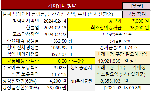 @2024-02-14 청약마감 전체경쟁률 1,988.84:1, 비례경쟁률 3,977.67:1, 균등배정 0.28주