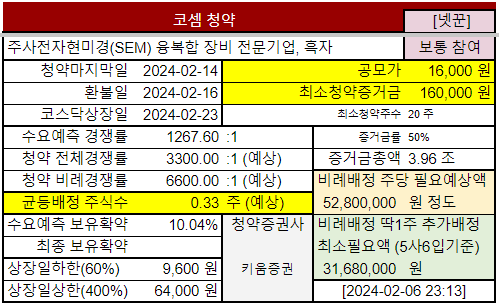 @2024-02-06 #코셈 수요예측결과 기관경쟁률 1,267.60:1 (좋은편), 기관보유확약 10.04% (좋은편), 공모가 16000원 (공모가 밴드 12,000~14,000 위), 경쟁률은 상향 조정했습니다.