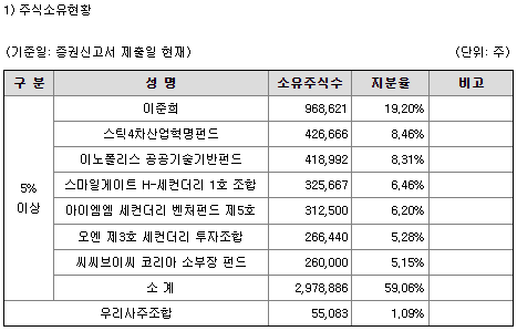 최대주주 이준희 대표이사 19.20% 지분포함 특수관계인까지 경영권지분은 24.65%이고, 여러 투자조합이 있으며, 1%미만 소액주주는 90명 12.57% 수준입니다.