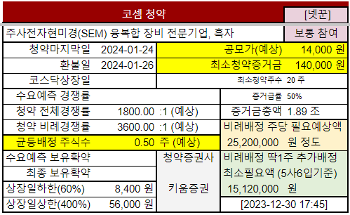 @2024-01-10 #코셈 청약일정 연기: "1.23~1.24수" → "2.13~2.14수"