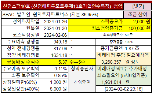 @2024-01-25 최소청약증거금 10만원입니다. 청약단위 업데이트를 안했네요.