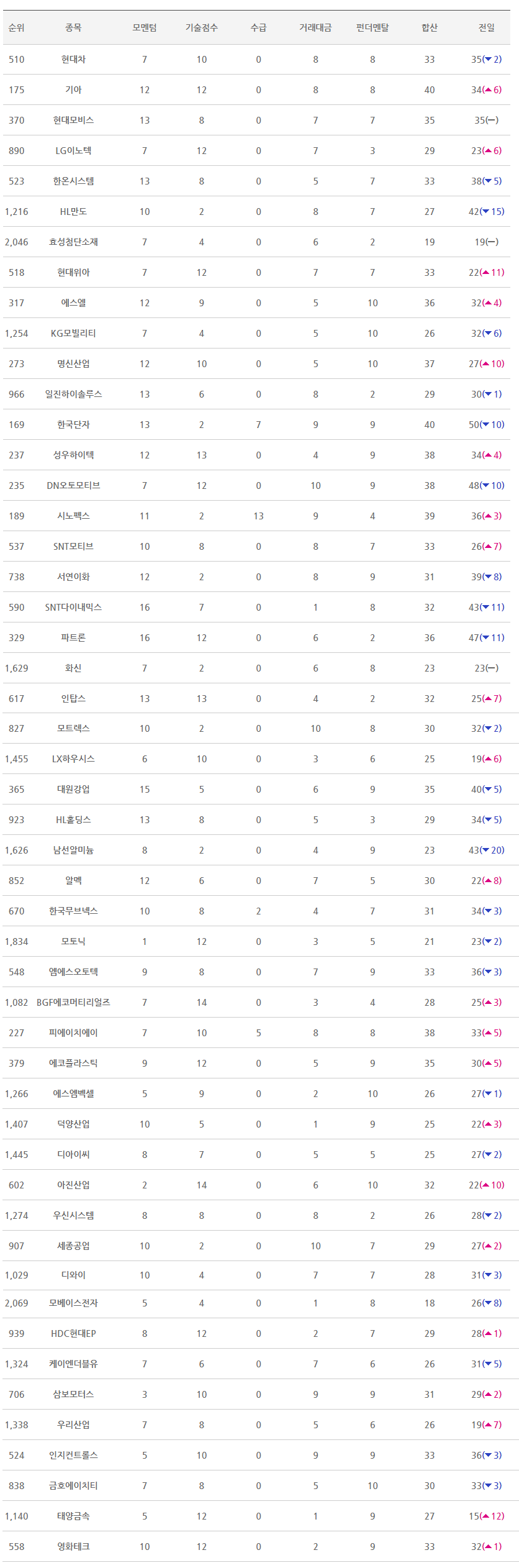 #현대차 #기아 #현대모비스 #LG이노텍 #한온시스템 #HL만도 #효성첨단소재 #현대위아 #에스엘 #KG모빌리티 #명신산업 #일진하이솔루스 #한국단자 #성우하이텍 #DN오토모티브 #시노펙스 #SNT모티브 #서연이화 #SNT다이내믹스 #파트론 #화신 #인탑스 #모트렉스 #LX하우시스 #대원강업 #HL홀딩스 #남선알미늄 #알멕 #한국무브넥스 #모토닉 #엠에스오토텍 #BGF에코머티리얼즈 #피에이치에이 #에코플라스틱 #에스엠벡셀 #덕양산업 #디아이씨 #아진산업 #우신시스템 #세종공업 #디와이 #모베이스전자 #HDC현대EP #케이엔더블유 #삼보모터스 #우리산업 #인지컨트롤스 #금호에이치티 #태양금속 #영화테크