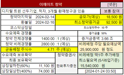 2024-01-15 ChosunBiz: [IPO 뜯어보기] 이에이트, 2년 뒤 매출 9배 성장으로 몸값 정했는데…