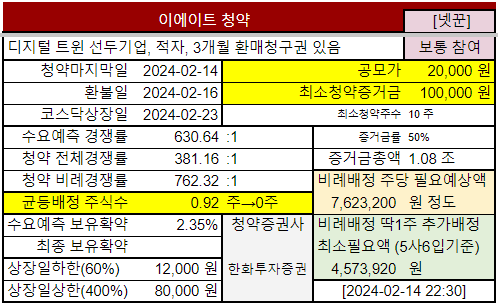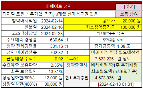 @2024-02-14 청약마감 전체경쟁률 381.16:1, 비례경쟁률 762.32:1, 균등배정 0.92주