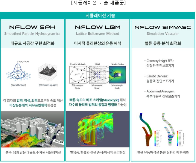 - 국내 최초 입자 기반 시뮬레이션 엔플로우(NFLOW) 개발했고, 다양한 실제 상황의 시뮬레이션을 가능하게 하는 디지털 트윈 업체답게 미래가치는 충분합니다. 다만 적자 상황이라 기술특례상장방식을 택해 상장을 진행합니다. 거기다가 유통물량 많고 스톡옵션도 많고 다른 상황은 좋지않습니다.