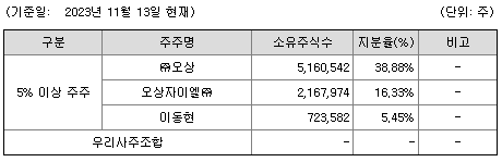 최대주주는 #오상 모회사와 #오상자이엘 관계회사, #오비트 관계회사 등 특수관계인 포함하면 62.21% 경영권 지분이며, 여러 주주들이 있으며, 1%미만 소액주주는 3760명 30.62% 수준입니다.