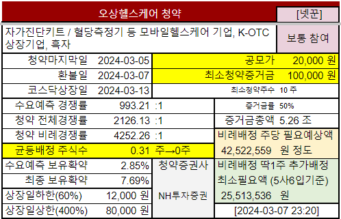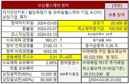 코로나 당시 자가진단키트로 많은 호황이 지난 후 진단업체 실적 하락세속에 홀로 고공행진중인 #오상헬스케어 공모주청약 정보입니다. 특히 CGM (연속혈당측정기) 개발계획과 전망이 밝아보이네요. K-OTC 종목이라 현재 사용하시는 증권앱으로 거래가 가능한 비상장주식입니다.