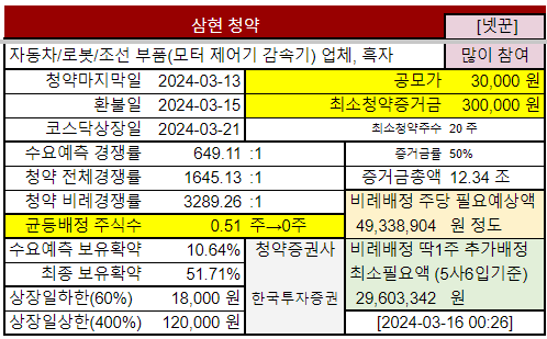 @2024-03-13 청약마감, 전체경쟁률 1,645.13:1, 비례경쟁률 3,289.26:1, 균등배정 0.51주