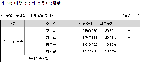 최대주주 황희종/황성호 대표이사 일가족이 85.05% 지분을 보유하고 있고, 특수관계인 7명 지분은 0.01% 수준이네요. 1%이상 주주는 한국투자+개인 3명 있는데 보유확약했고, 1%미만 소액주주는 10명 0.92% (특수관계인 7명빼면 3명)로 낮습니다.