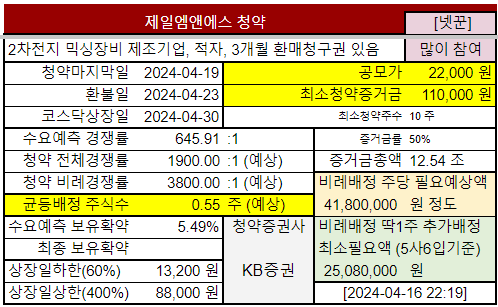2024-03-21 THE STOCK: [IPO] 2차전지 믹싱장비 ‘제일엠앤에스’ 최대 432억 공모…일반청약자에 환매청구권