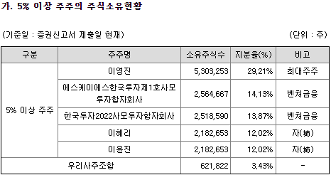 최대주주인 이영진 대표이사와 이혜리/이윤진(대표이사 누나) 등 특수관계인 포함해 58.31% 경영권지분이 있으며, 1% 미만 소액주주 1명(투자조합) 0.41% 수준인데, 1%이상은 투자조합 여러곳이 있습니다만 대부분 보유확약을 했습니다.