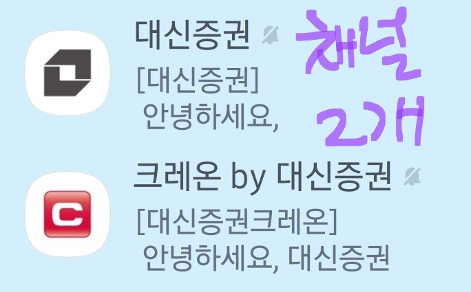 이런 톡은 총 3가지 방식으로 오는데, 대신증권 카카오톡 채널 2종류와 문자메시지로 전송됩니다.