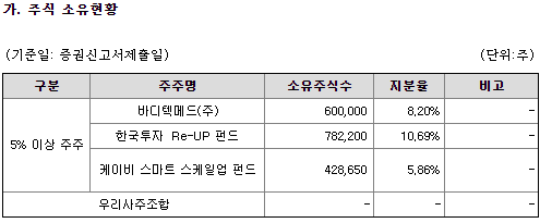 최대주주 최종석 대표이사 지분 29.88%외에 특수관계인포함해 경영권 지분은 34.36%이고, 회사 자사주는 8.2%, 투자조합등을 제외하고 1% 미만 소액주주는 87명 13.20% 수준입니다.