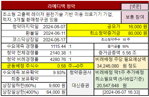 | 대신증권 | 【38】 - 【iPO】 초소형 고출력 레이저 원천기술 기반 미용 의료기기 기업, 적자, 3개월 환매청구권 있음 | ||||