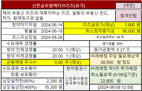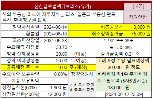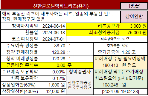 | 신한투자증권 한국투자증권 | 【38】 - 【iPO】 해외 부동산 리츠에 재투자하는 리츠, 일종의 부동산 펀드, 적자, 환매청구권 없음 | ||||