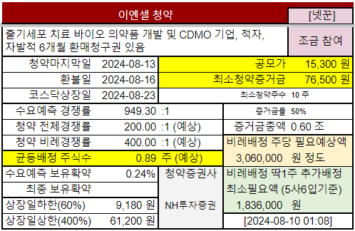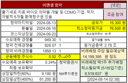 @2024-07-18 #이엔셀 청약일정 미정상태였는데 8월로 연기: "8.1~8.2금" → ""8.12~8.13화"