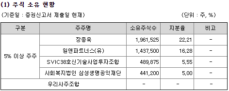 최대주주 장종욱 대표이사가 22.21% 지분이 있고, 가족지분까지 22.61% 경영권지분과 여러 투자조합들이 있으며, 1% 미만 소액주주는 88명 7.57% 수준입니다.
