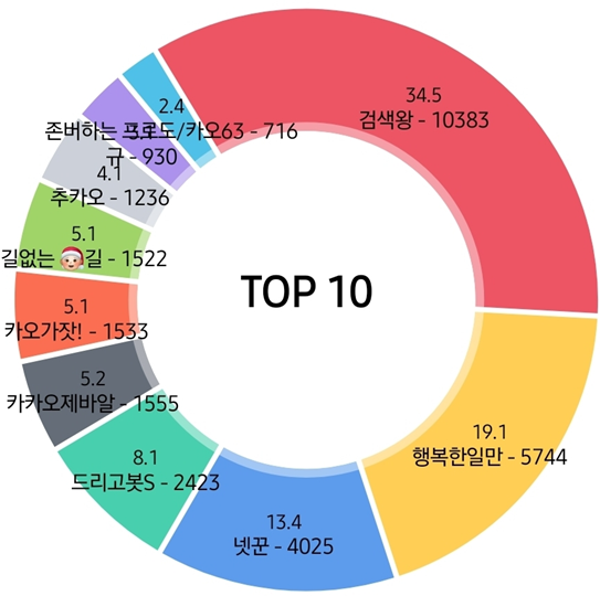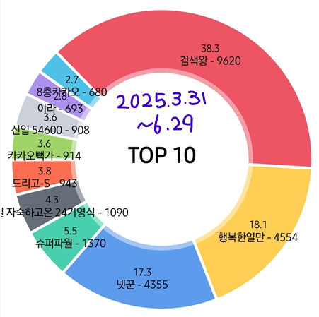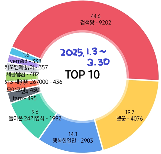 1. 검색왕 9,202회 2. 넷꾼 4,076회 3. 행복한일만 2,903회 4. 돌아온 24기영식 1,992회 5. taro 495회 6. 모야모야 450회 7. 카카오 50613 네이버 267000 436회 8. 새콤달콤 402회 9. 카카오땜에 늙어 357회 10. vernon 338회 11. 고층입주민 302회