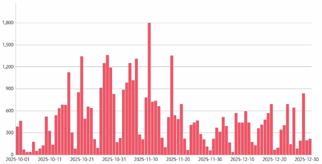 4분기 채팅건수: 총44,834건 채팅대화자수 347명, 일평균 487건 최고채팅건수 2025-11-11 1803건 (빼빼로데이)