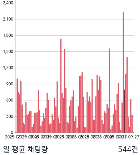 3분기 채팅건수: 총51,752건 채팅대화자수 451명, 일평균 544건 최고채팅건수 2025-09-23 2226건