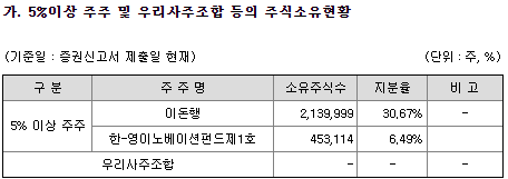 최대주주 이돈행 대표이사의 지분이 30.67%이고, 특수관계인을 포함해 36.16%의 경영권 지분과 여러 투자조합들이 있으며, 1%미만 소액주주는 126명 13.64%로 좀 많은 편입니다.