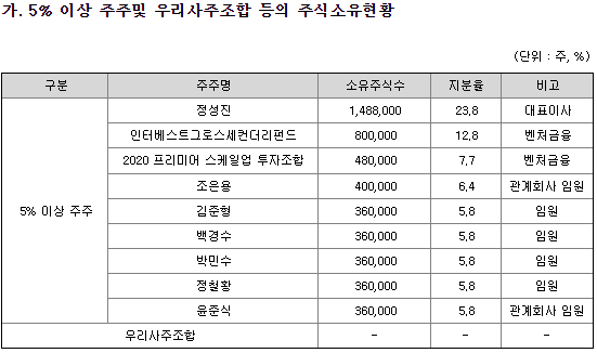 최대주주 정성진 대표이사가 23.85% 지분이 있고, 임원/관계사 임원등 특수관계인을 포함하면 61.6% 경영권 지분이 있습니다. 여러 투자조합들외에, #위지윅스튜디오 2.06% 수준 지분 있습니다. 1% 미만 소액주주는 48명 8.8% 수준입니다. 상장이후 최대주주 지분이 20%미만으로 되고 경영권지분이 50% 이하로 내려가는 점 참고하세요.