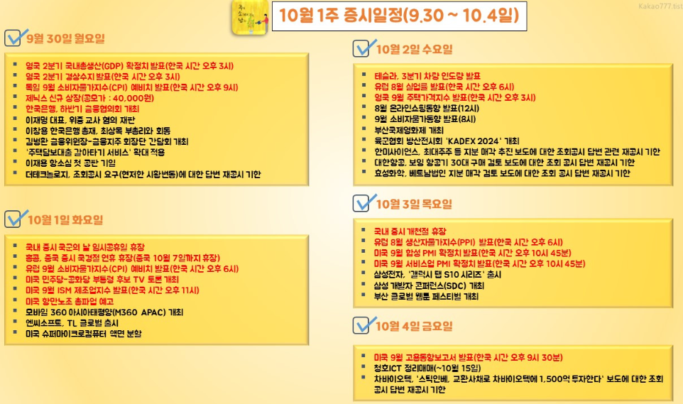 9월다섯째주/10월첫째주 주별 일정 정리한 내용입니다. (주소남 증시일정 사진은 블로그 공유를 허락받았습니다)