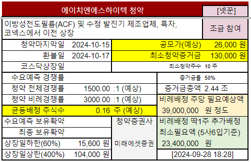 @2024-10-15 청약첫날 전체경쟁률 133.80:1, 비례경쟁률 267.60:1, 균등배정 1.06주