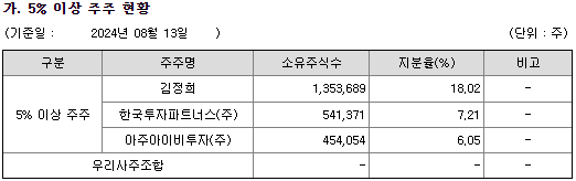 최대주주 김정희 대표이사가 18.02% 보유, 임원/자사주 등 특수관계인 포함해도 18.98% 수준으로 경영권 지분이 낮습니다. 투자조합 두곳이 7.21% 6.05%외엔 소액주주들이며, 1%이상 소액주주도 꽤 있고, 1%미만 소액주주는 1214명 42.18% 수준입니다.